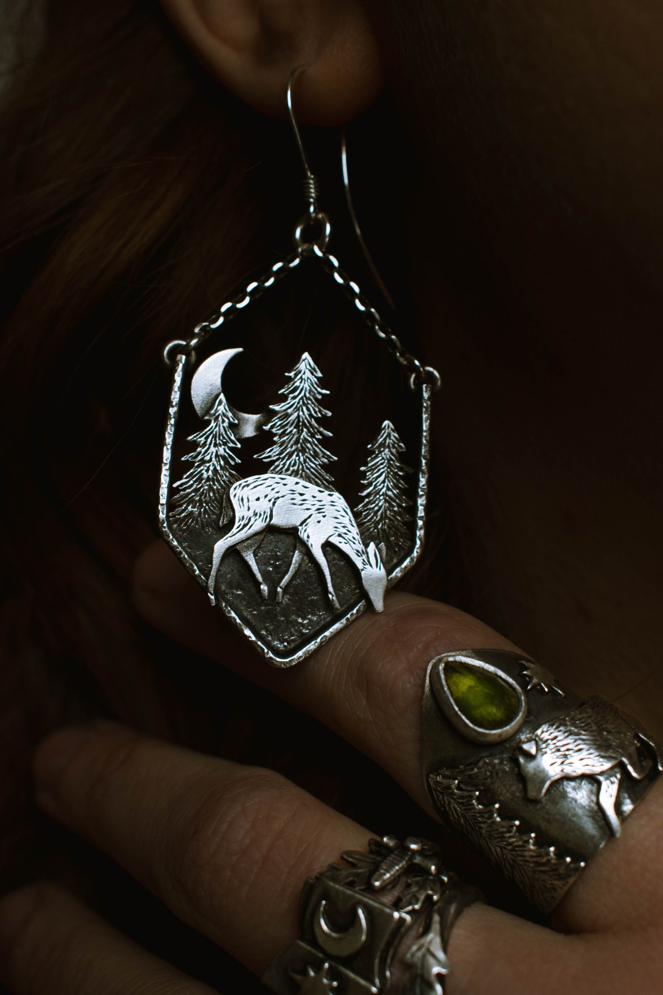 Though these pair of earrings are not identical they are still a perfect and power match and tell a story together. The wolf representing wildness and freedom, the raven symbolizing transformation and magic and the sweet and gentle deer bringing tenderness and intuition.